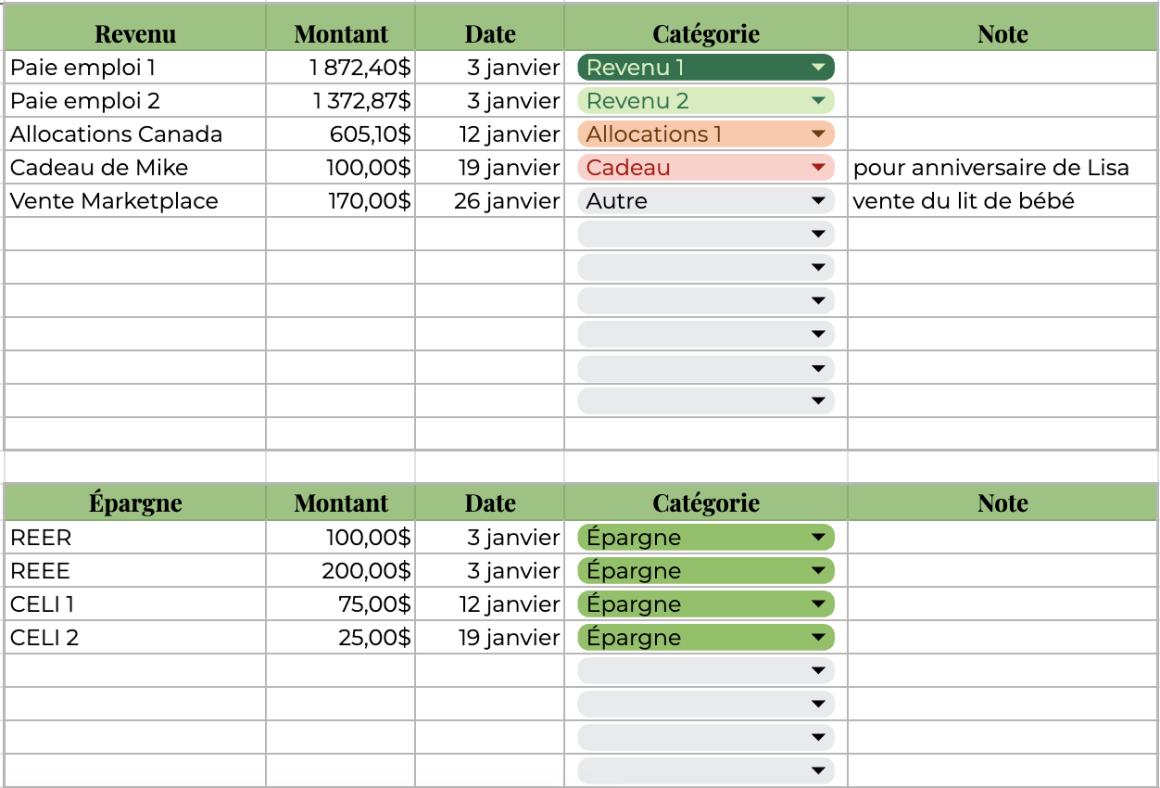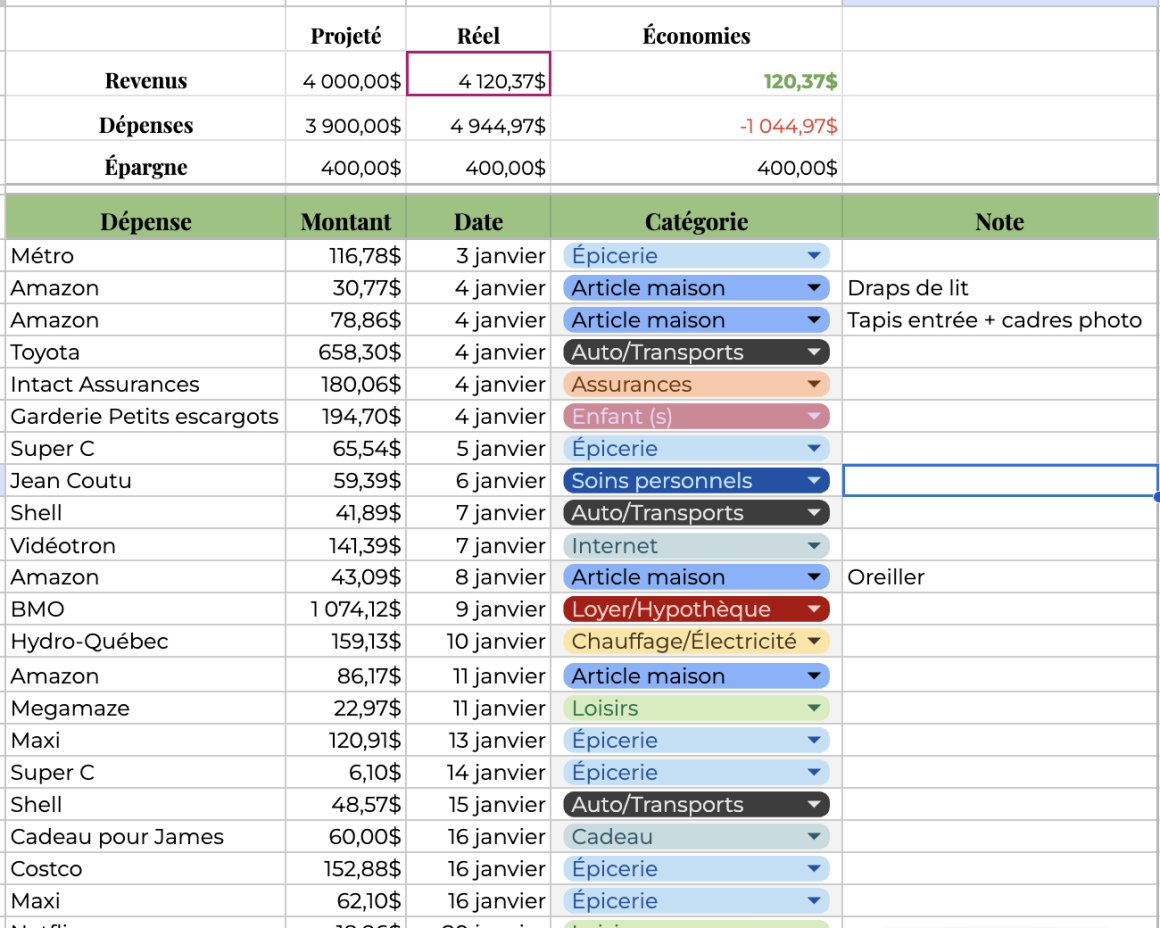 Ça fait plusieurs années que je veux partager mon astuce budgétaire préférée pour savoir exactement combien d’argent rentre et sort de mes poches, à la cenne près. Attention, je suis consciente que tout le monde n’a pas les mêmes revenus ni les mêmes priorités au niveau des dépenses.