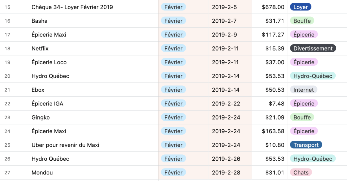 Il y a des applications financières qui se connectent directement sur les comptes bancaires pour faire automatiquement ce suivi de dépenses. Mais je préfère éviter les tierces parties qui ont accès à ces données sensibles. En plus, analyser ligne par ligne mon relevé bancaire me permet d’être plus investie et en contrôle de ce qui s’y passe.